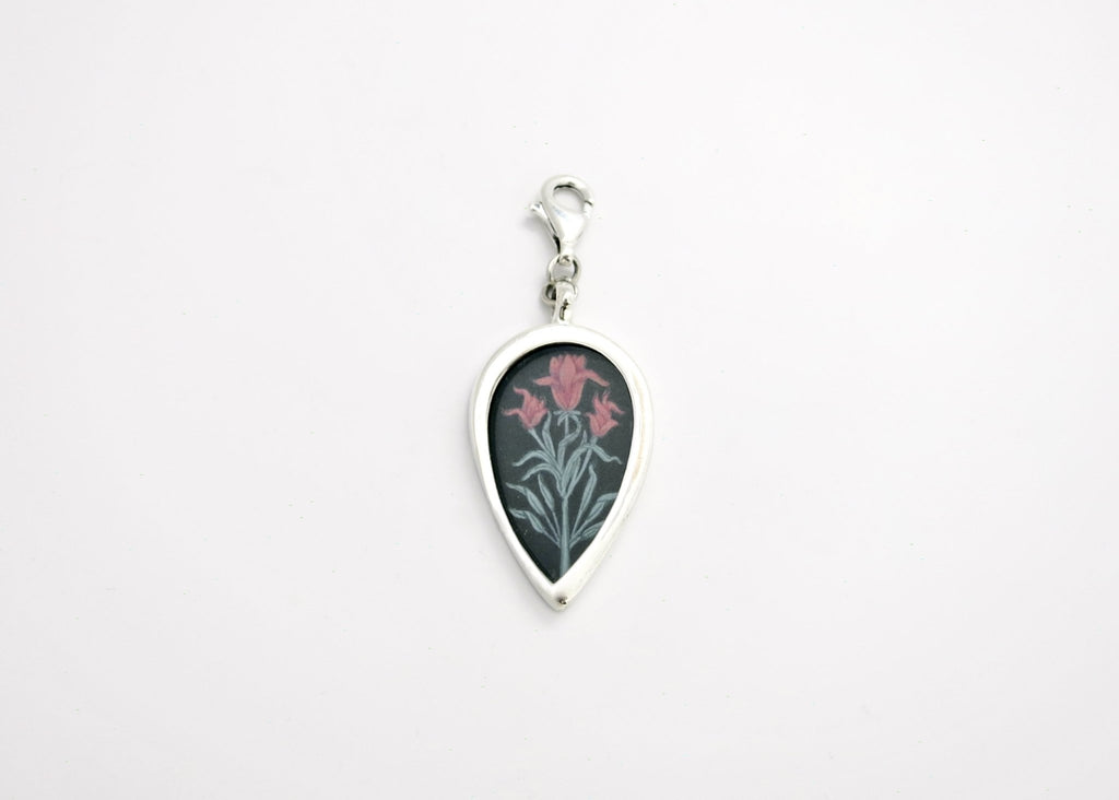 (7) lily, Mughal-inspired, inverted drop shape, miniature painting charm in black: 4.9 cm long and 2 cm at the widest.