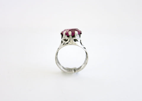 Elegant profile, vibrant color, and eminently wearable. This stunning fuchsia glass stone ring, flanked by floral cut-work detailing, will sit pretty upon any finger.